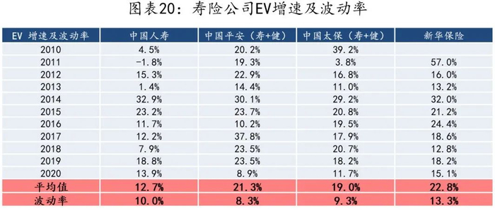 由于假设与实际值的差异,如采用激进假设下获得的当期高EV或NBV、VIF,也将在未来年度逐步衰减和压缩利润空间以反应真实的利润情况。对于保险股的当期盈利情况,除了主要看增速外,更重要是公司估值指标的波动性小。我们拉平EV的折现率假设来看,波动率从小到大:平安