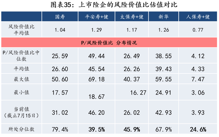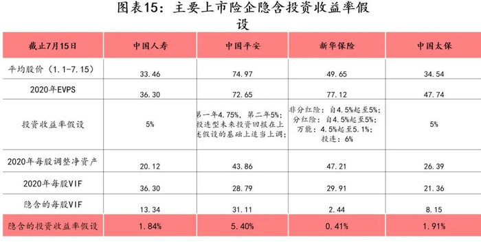 截止7月15日,主要上市险企的PEV倍数为:国寿(0.71x)、平安(0.76x)、太保(0.53x)、新华(0.53x),当前估值低于1倍PEV。假设全部为投资收益率假设带来的影响,当前平均股价所隐含的投资收益率假设分别为:1.84%、5.4%、0.41%、1.91%。除平安外,其他上市险企的投资收益率假设5%与二级市场的预期有差异。