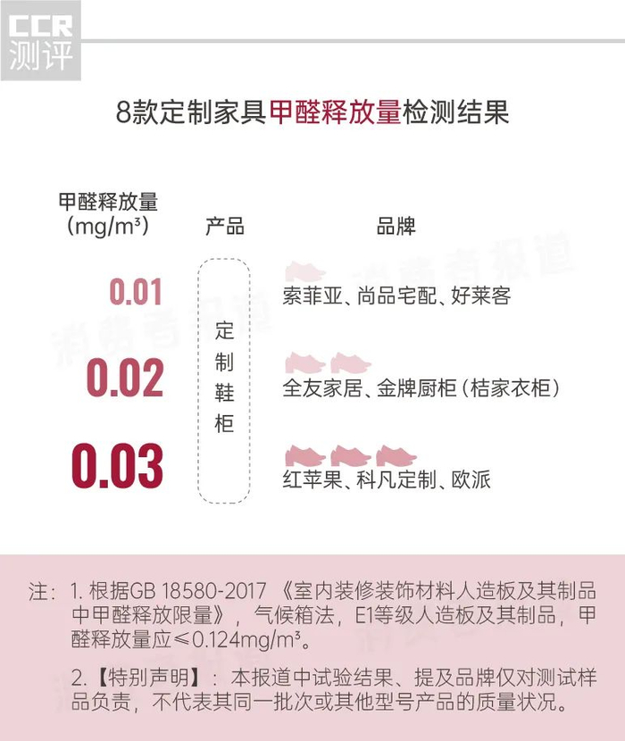 其中索菲亚、尚品宅配、好莱客等3款定制鞋柜的甲醛释放量均为0.01mg/m3,是8款定制家具中较低的;而红苹果、欧派、科凡定制的甲醛释放量均为0.03mg/m3,释放稍差。