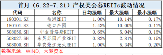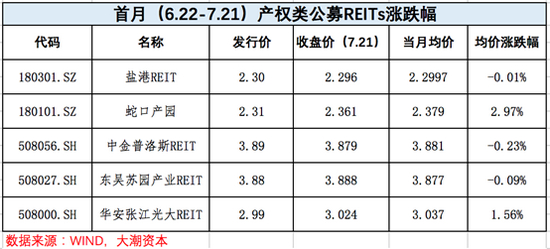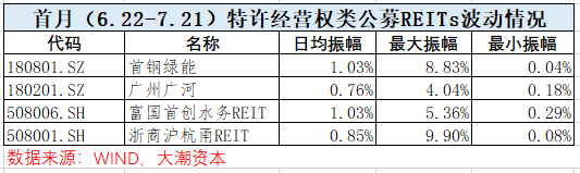 考虑到发行首日存在市场关注和情绪影响的特殊情况,排除首日表现后,我们看9只公募REITs基金次日起一个月的表现(6月22日至7月21日)。同时按照底层资产属性不同,我们将公募REITs基金分为产权类基金和特许经营权类基金,分别进行统计分析。