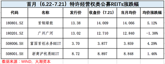 从统计数据可以看出,特许经营权类公募REITs上市首月除广州广河项目外均实现上涨,其中均价涨幅最大的是首钢绿能项目(5.12%)。