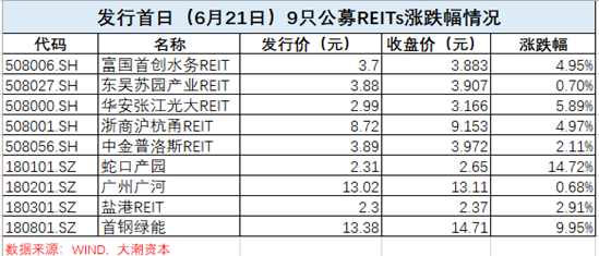 6月21日,备受瞩目的9只公募REITs基金在上交所和深交所上市发行。由于REITs是资本市场全新的金融产品,在各界关注下,9只基金上市首日均表现“气势如虹”。