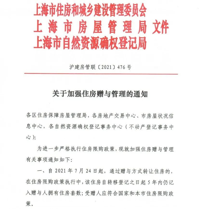 7月23日,上海市住房城乡建设管理委、市房管局、市自然资源确权登记局出台加强住房赠与管理规定,进一步深化落实“沪十条”“沪七条”等文件精神,加强房地产市场调控,强化市场监管,进一步严格执行住房限购政策。
