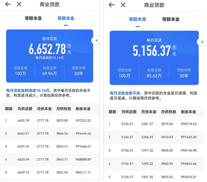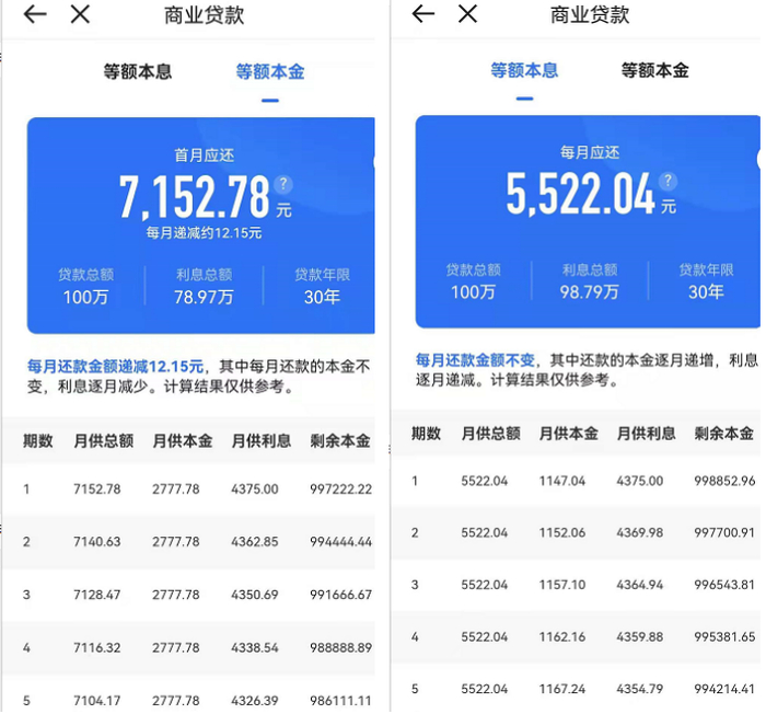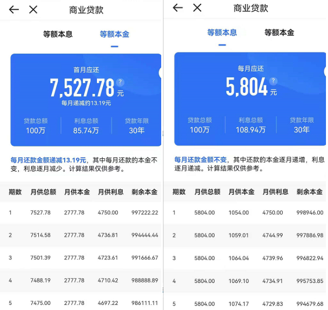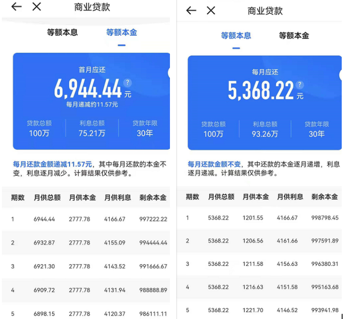 办理二套房商业贷款的用户,按等额本息计算,月供多出281.96元,利息总额多出10.15万元;按等额本金计算,将要多还6.77万元。