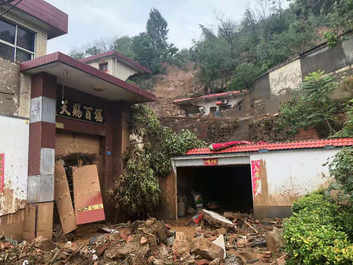 米河镇东竹园村一处山体滑坡,导致邻近村民房屋受损。同时,大量泥水倾泻在村道上,让人行路艰难。