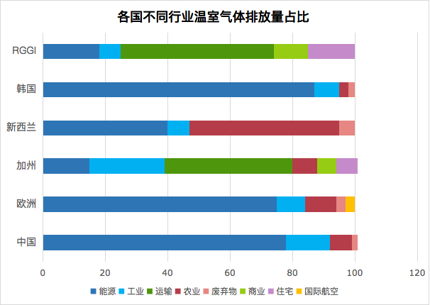 2、韩国和新西兰能源项中包含交通运输排放,新西兰交通能源排放占比达21%;加州和RGGI的能源排放集中表现为电力部门排放