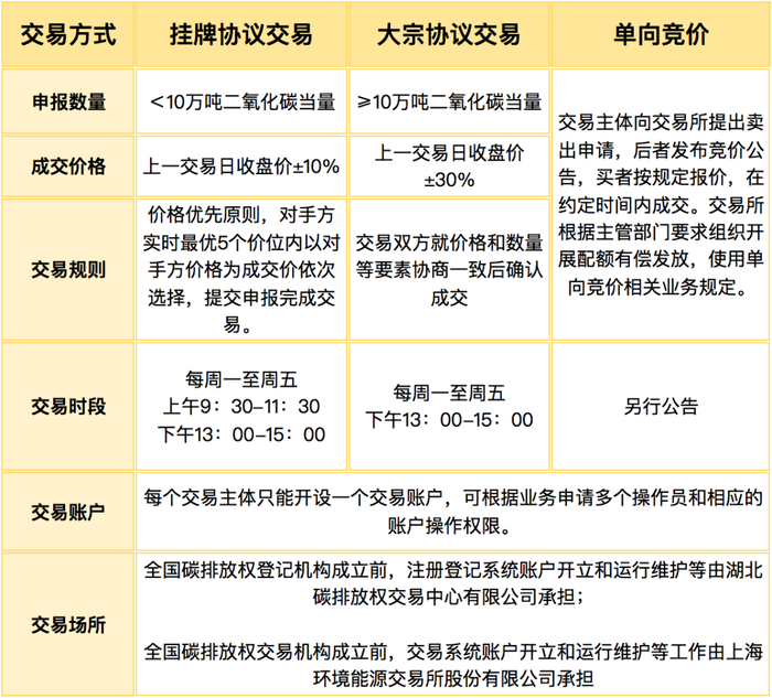 从交易环节来看,交易系统初步建立,初期交易产品为全国碳配额(CEA),交易主体为需要履约的控排电企。交易时段与股市一样,交易方式包含协议转让、单向竞价或者其他符合规定的方式。协议转让包括挂牌协议交易和大宗协议交易,以10万吨二氧化碳当量为界,小于10万吨用前者,否则用后者。