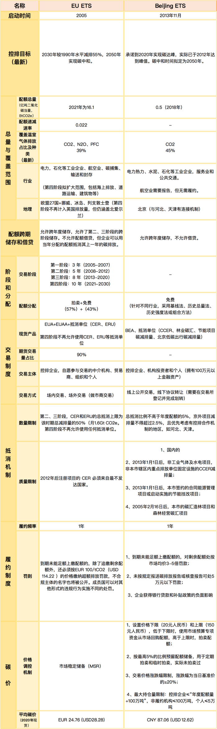以国内碳价最高的北京碳市场与欧盟碳市场进行对比,可以看出一些区别: