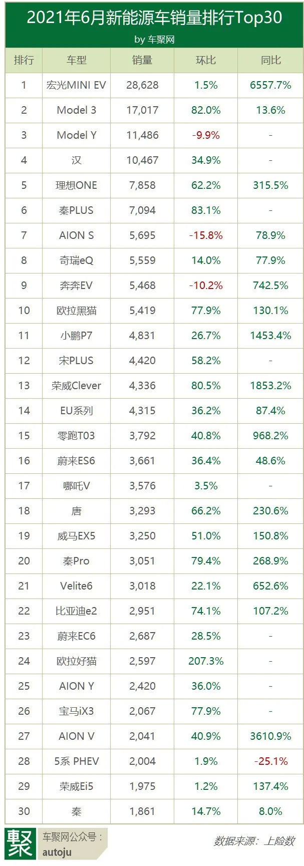 上汽通用五菱被比亚迪超过,6月销售30,115辆,排名降至第二。与5月份相比,其销量下滑了2.4%,也是榜中唯一下滑的车企。这也印证了一句老话:逆水行舟,不进则退。不过,其旗下车型宏光MINI EV依旧是新能源汽车市场霸主,且地位无人撼动。