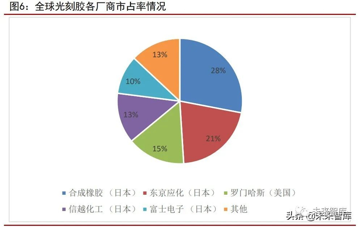 光刻胶生产技术较为复杂,技术壁垒高,尤其是半导体光刻胶技术壁垒最高。全球 光刻胶行业呈现寡头垄断格局,主要被日美公司垄断,前五大光刻胶企业合成橡胶 (日 本)、东京应化 (日本)、罗门哈斯(美国)、信越化工 (日本)、富士电子 (日本) 占据了全球光刻胶市场 87%的市场份额。