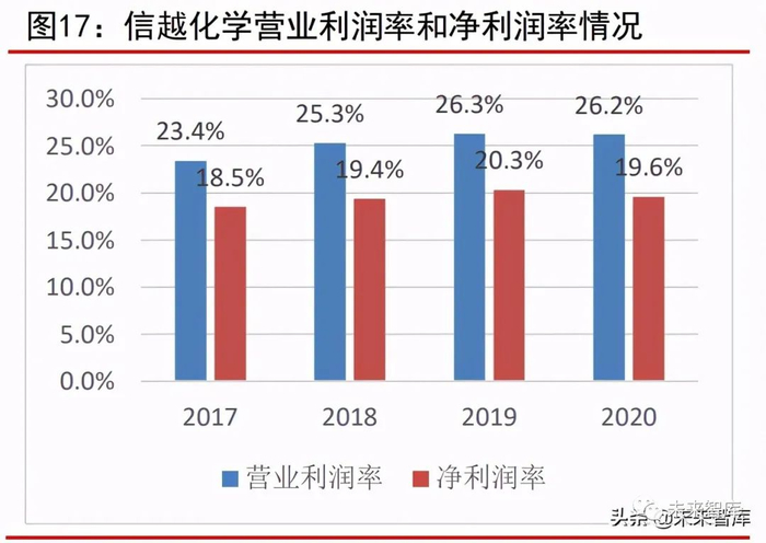 2017-2020 年,公司营业利润率分别为 23.4%、25.3%、26.3%、26.2%;公司净利润 率分别为 18.5%、19.4%、20.3%、19.6%。公司净资产收益率分别为 11.9%、12.8%、12.3%、 10.7%。2020 年,公司电子和功能材料部门营业利润率为 29.90%。