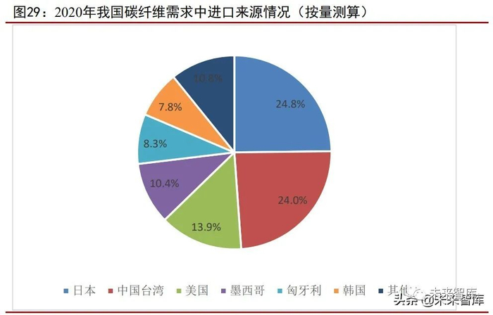 2020年我国碳纤维及制品需求量为4.89万吨,其中进口量3.04万吨,占比62.1%, 国产碳纤维1.85万吨,占比37.8%。我国碳纤维进口来源:日本7532吨,占比24.8%;中国台湾7299吨,占比24.0%;美国4209吨,占比13.9%。