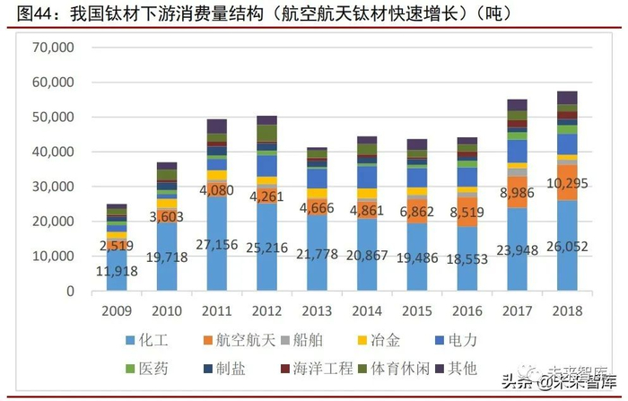 近几年我国航空航天钛材需求量保持高速增长,根据中国有色金属工业协会数据, 2015-2018年航空航天钛材消费量分别为6862吨、8519吨、8986吨、10295吨,分别同比 增长41%、24%、5%、14.6%。这与我国航空航天高速发展密切相关,运-20量产,太行发 动机稳定量产。2018年我国化工钛材消费量为2.61万吨,随着我国航空航天钛材消费量 高速增长,未来有望超过化工领域钛材消费量。