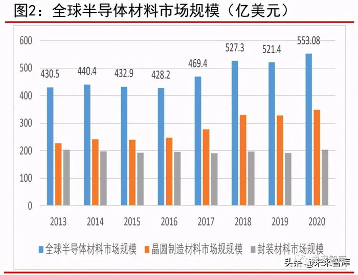 根据国际半导体产业协会(SEMI)的最新报告,2020年,全球半导体材料市场规模 为553.08亿美元,同比增长4.9%,其中全球晶圆制造材料市场规模为349亿美元,同比 增长6.5%,占半导体材料整体规模的63%;全球封装材料市场规模为204亿美元,同比增 长2.3%,占半导体材料整体规模 37%。