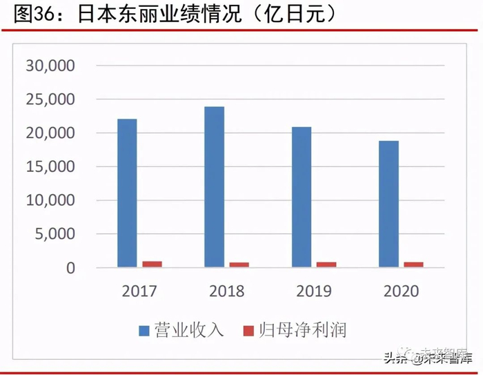 2017-2020 年,公司营业收入分别为 22049 亿日元、23888 亿日元、20912 亿日元、 18836 亿日元,2020 年公司营业收入同比下降 9.9%。2020 年,公司碳纤维复合材料实 现收入 1829 亿日元,同比下降 22.79%,占公司总收入比例 9.7%。