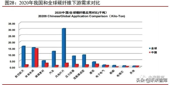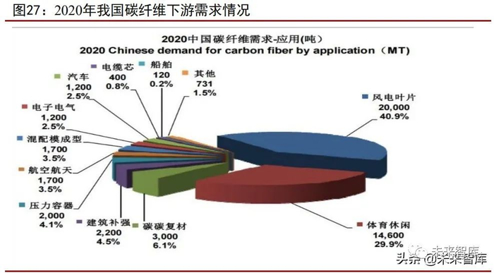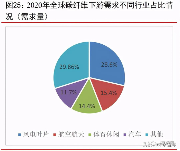 风电叶片、航空航天、体育休闲和汽车占碳纤维需求量的70%。2020年,全球碳纤 维需求量10.69万吨,其中风电叶片需求量3.06万吨,占比28.6%;航空航天需求量1.65 万吨,占比15.4%;体育休闲需求量1.54万吨,占比14.4%;汽车需求量1.25万吨,占比 11.7%。