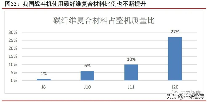 我国战斗机使用碳纤维复合材料比例也不断提升,歼-8使用碳纤维复合材料比例1%, J10使用碳纤维复合材料比例6%,J11碳纤维复合材料使用比例10%。另外,我国最新J20、 直20大量使用复合材料。