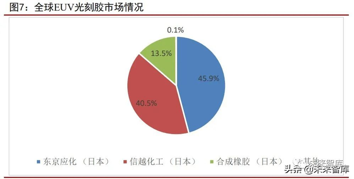 随着集成电路先进制程的发展,EUV 光刻胶成为半导体光刻胶发展趋势。目前市场 最先进的量产芯片工艺是 5nm 工艺,台积电表示将在 2022 年下半年开始大规模生产 3nm 工艺。目前,EUV 光刻胶市场被日本垄断,日本三家企业东京应化、信越化工、合成橡 胶占据 EUV 光刻胶 99.9%的市场份额。