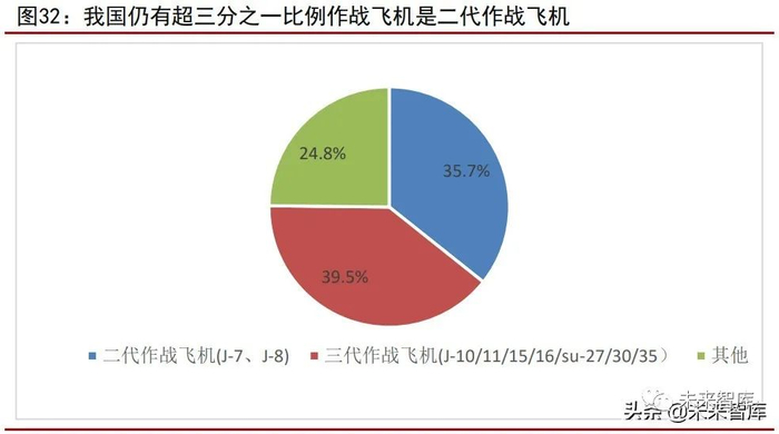 我国仍有超三分之一比例作战飞机是二代作战飞机。这里作战飞机包含有战斗机、 战斗轰炸机、强击机、战略轰炸机等装备有进攻性武器系统的固定翼战机。根据《飞行 国际》发布的《WorldAirForces2021》,我国作战飞机中,有J-7、J-8二代作战飞机561 架,占我国作战飞机比例高达35.7%;三代作战飞机J-10有260架、 J-11/15/16/su-27/30/35有360架,合计620架,占我国作战飞机比例为39.5%;另外, 第四代作战飞机J20有19架。美国作战飞机基本上是三代以上作战飞机,并拥有四代作 战飞机F-22 178架,F-35 196架(不包括训练飞机)。二代作战飞机已经不适合现代战 争,随着我国第三代作战飞机日趋成熟,新型战机歼-16,歼-10c以及五代隐身战斗机 歼-20的相继服役,未来二代作战飞机将逐渐退役。
