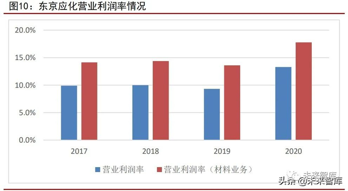 2017-2020 年,公司营业利润率分别为 9.9%、10.0%、9.3%、13.3%,其中材料业务 营业利润率分别为 14.2%、14.4%、13.6%、17.8%。