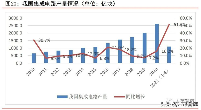 2015 年,随着《国家集成电路产业发展推进纲要》等一系列政策落地实施,国家集 成电路产业投资基金开始运作,中国集成电路产业保持了快速增长。2020 年,我国集成 电路产量 2612.6 亿块,同比增长 16.2%;2021 年 1-4 月,我国集成电路产量 1104.0 亿 块,同比增长 51.7%。