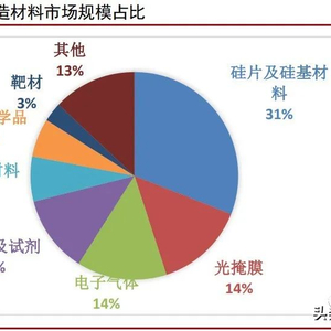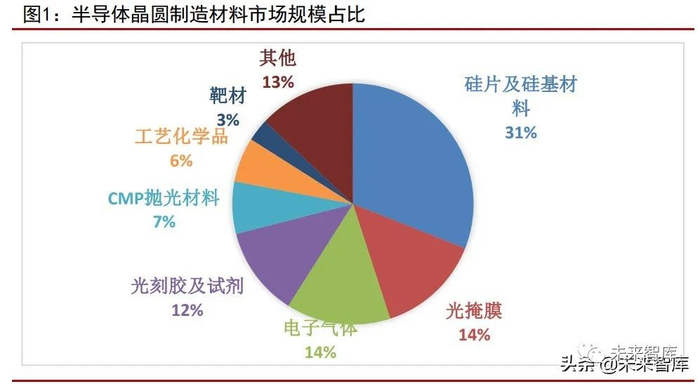 半导体材料市场可以分为晶圆材料和封装材料市场。其中,晶圆材料主要有硅片、 光掩膜、光刻胶、光刻胶辅助设备、湿制程、溅射靶、抛光液、其他材料。封装材料主 要有层压基板、引线框架、焊线、模压化合物、底部填充料、液体密封剂、粘晶材料、 锡球、晶圆级封装介质、热接口材料。