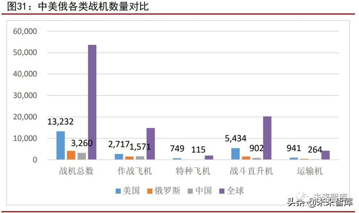 根据《飞行国际》发布的《WorldAirForces2021》,我国现有各类战机总数3260架, 美国各类战机总数13232架,俄罗斯各类战机总数4143架。其中我国作战飞机1571架、 特种飞机115架、战斗直升机902架、运输机264架;美国作战飞机2717架、特种飞机749 架、战斗直升机5434架、运输机941架;俄罗斯作战飞机1531架、特种飞机130架、战斗 直升机1540架、运输机429架。