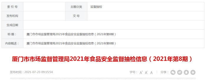中国质量新闻网讯 7月23日,厦门市市场监督管理局网站发布2021年第8期食品安全监督抽检信息。本期检出1批次速冻秋刀鱼不合格,具体信息如下: