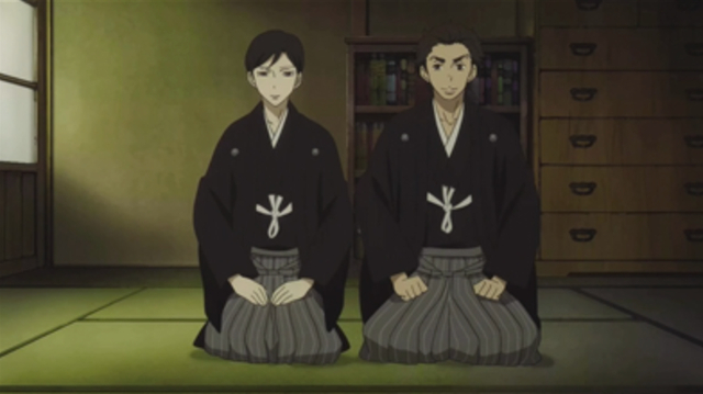《昭和元禄落语心中》中的两位主角菊比古(有乐亭八云)与助六,他们正在拜师学艺。