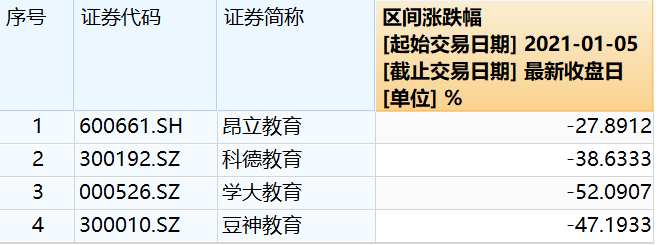 二级市场表现方面,今年内,昂立教育、科德教育、学大教育、豆神教育的股价累计分别下挫27.89%、38.63%、52.09%、47.19%,大幅跑输主要股指。
