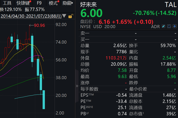 截至最新收盘,好未来股价报6美元,相比今年2月90.96美元的股价高点,累计跌幅超93%,总市值蒸发约3550亿元。此外,新东方、网易有道(DAO.N)、精锐教育(ONE.N)年内分别累计下挫83.16%、81.94%。