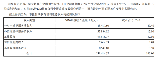 财报显示,学大教育的教培业务覆盖K12阶段全学科、全学段、全品类,授课模式主要包括“一对一辅导”、“个性化小组辅导”、全日制文化课辅导、线上网校等。2020年,学大教育的“一对一辅导”服务费收入达11.84亿元,占总收入比重约50%。
