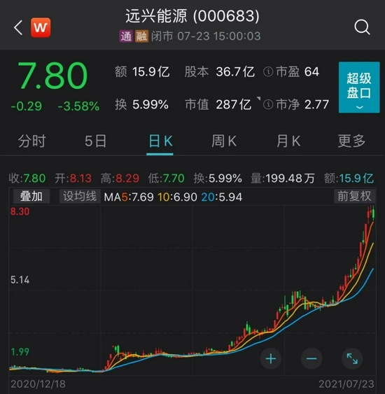7月23日,远兴能源报收于7.8元,年内涨幅已高超260%。来源:Wind