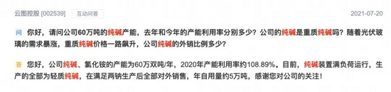 公司已形成复合肥、联碱、磷化工及食用盐等协同发展的产业格局。7月20日,公司在投资者互动平台表示,公司纯碱、氯化铵的产能分别为60万吨/年,去年产能利用率为108.89%。目前纯碱装置满负荷运行,生产的全部为轻质纯碱,在满足两钠生产后全部对外销售,年自用量约5万吨。