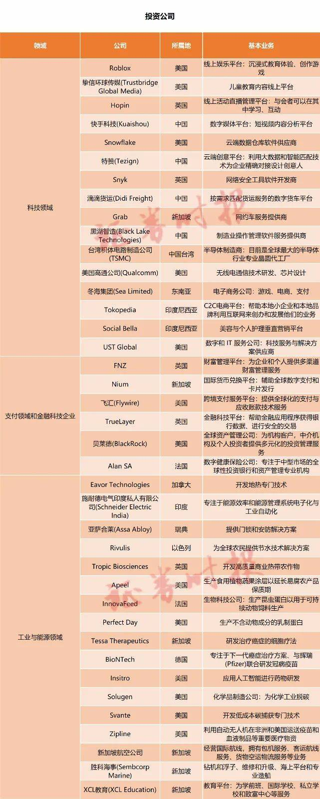 科技企业方面,淡马锡投资了线上娱乐平台Roblox、网络安全工具软件开发商Snyk、线上活动直播管理平台Hopin等。
