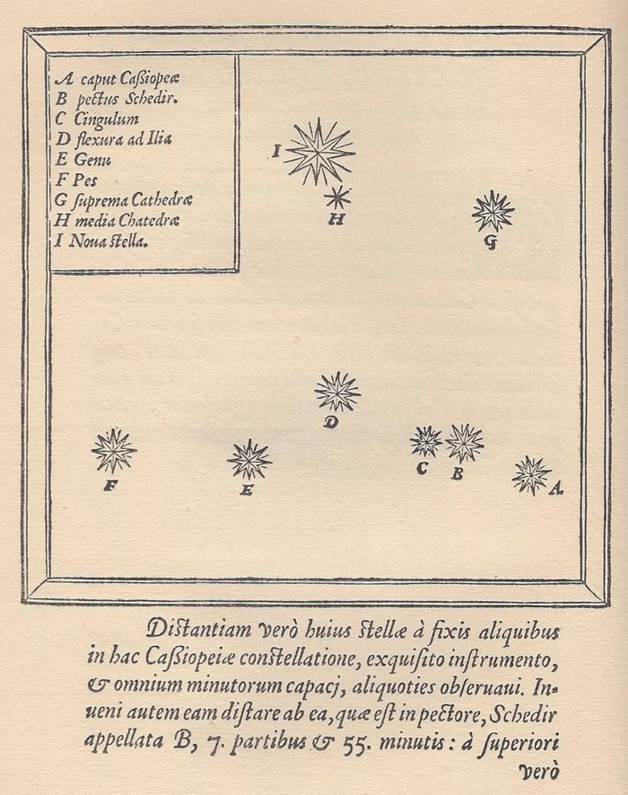 第谷对“SN 1572”的记录,字母I为第谷超新星,第谷著作《De Stella Nova(论新星)》 图
