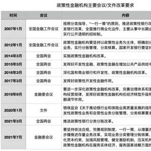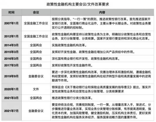 2021年7月6日召开的国务院金融委会议提出,政策性金融机构改革要继续加以推进,要坚持依法合规,完善规则制度,一行一策,从增量改革入手,渐进式、分步骤推进存量业务改革,实现业务分类管理分账核算,有序提高透明度,强化资本约束,加强风险管理等。
