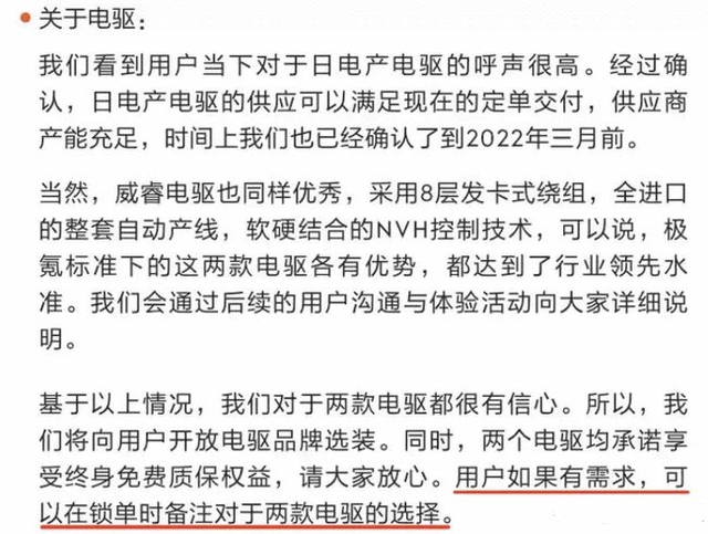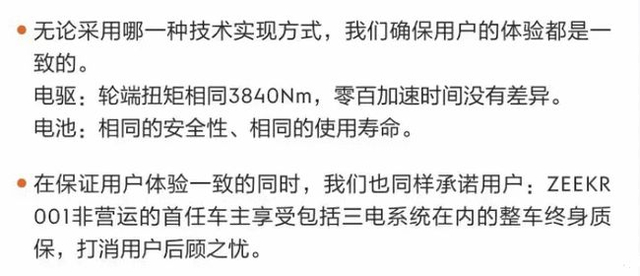 随后,该事件再次将极氪带回舆论风口,极氪也不得不再次发表声明,承诺如果用户有需求,可以在锁单时备注对于两款电驱的选择,并表示最终的量产后性能是一致的。