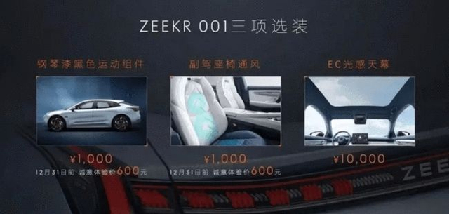 7月17日,极氪表示,配置方面,关注度较高的EC天幕的选装价格为1万元(最初顶配车型是标配),黑色运动套件以及座椅通风的选装价格均为1000元。针对12月31号前选装的用户,以上3个配置的选装价格提供6折优惠,分别为6000元和600元。