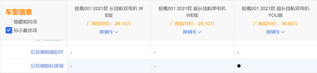 不过后来极氪官方又表示,WE版车型其实并没有标配隐私玻璃,是选配。但在目前极氪001的配置单中,没有见到后隐私玻璃的配置,并且暂未见到相关选配方案。