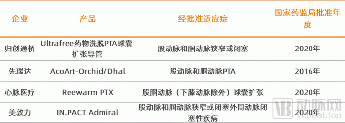目前,针对膝上股浅动脉(SFA)及腘动脉(PPA)病变,已经有五款已获批的DCB产品,分别由三家国内企业——归创通桥、心脉医疗、先瑞达和一家跨国企业美敦力制造。