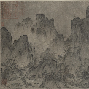 《远岫晴云图》绘制的是烟雨迷蒙时的风景,远山模糊不清,近树萧疏迷离,一条溪流潺潺自远处绕到赏者面前。图中左下角作一小丛树,间隔溪水的对岸是云气缭绕的疏林,远处是尖锐如刻削的山峦。