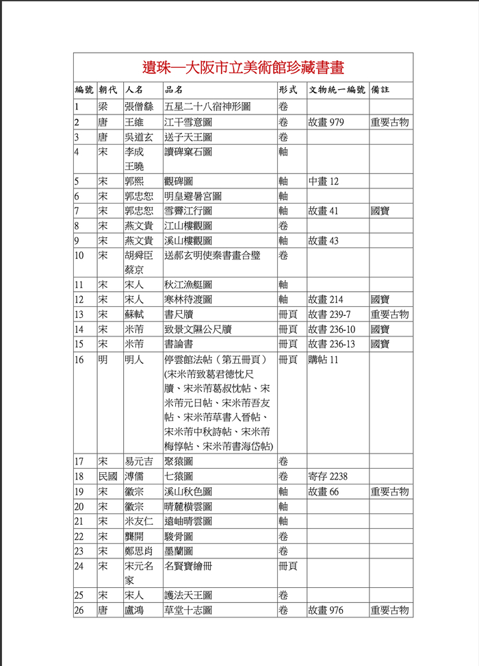 本次借展品原属日本知名中国书画收藏家阿部房次郎(1868-1937)爽籁馆旧藏,由其子阿部孝次郎于1943年捐赠给大坂市立美术馆。阿部氏深受中国美术成就感动,于战乱之20世纪初积极从日本和中国搜购字画精品,成就其重磅级收藏,本次展览展出包括南北朝张僧繇《五星二十八宿神形图》、五代时期李成及王晓合作之《读碑窠石图》、北宋燕文贵《江山楼观图》、南宋龚开《骏骨图》、宋米芾之子米友仁《远岫晴云图》、南宋郑思肖《墨兰图》等。其中不乏清宫旧藏,有些更是传世唯一孤品。