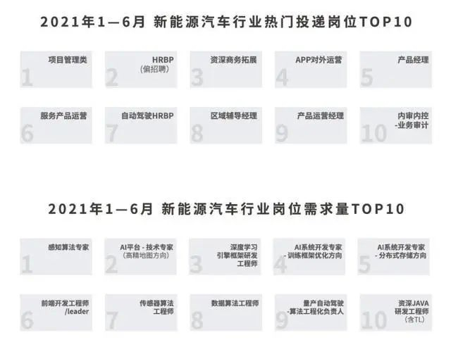随着车企的“抢人大战”重启,汽车业人才大迁移乘风而起。来自招聘的数据显示,新能源汽车已经成为新发职位增长最快领域之一,同比增长103.53%。而另一家招聘网站的数据显示,2021年以来,特斯拉、蔚来、理想、小鹏等企业招聘岗位数量、求职者关注热度持续攀升,其中自动驾驶研发、智能座舱设计、软件工程师、销售等岗位需求同比增幅超过1.8倍。