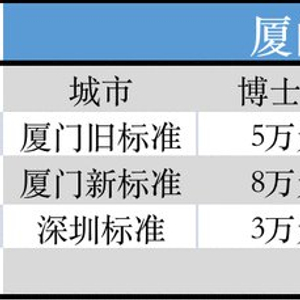 7月1日起,厦门对新引进的博士、硕士、“双一流”及世界排名前200名大学毕业生进行补贴,标准分别是8万元/人、5万元/人、3万元/人,其他高校应届本科生每人1万元。