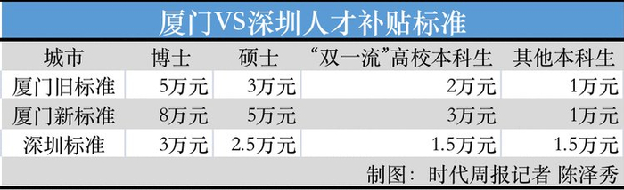 同为经济特区,厦门的人才补贴标准比深圳高了一倍——此前,深圳的人才补贴标准为本科生1.5万元/人、硕士2.5万元/人、博士3万元/人。9月1日起,深圳新引进人才不再受理发放租房和生活补贴。