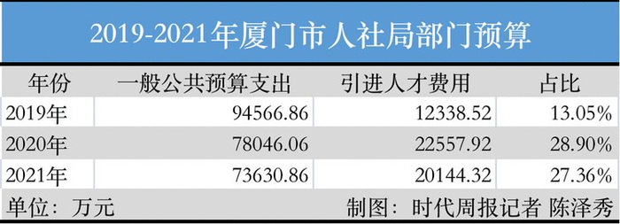 尽管厦门市人社局的总支出有所下降,但引进人才的费用却大幅提升——2019年为1.23亿元,占比13.05%,2020年提高到2.26亿元,占比28.9%,2021年为2.01亿元,占比仍然高达27.36%。