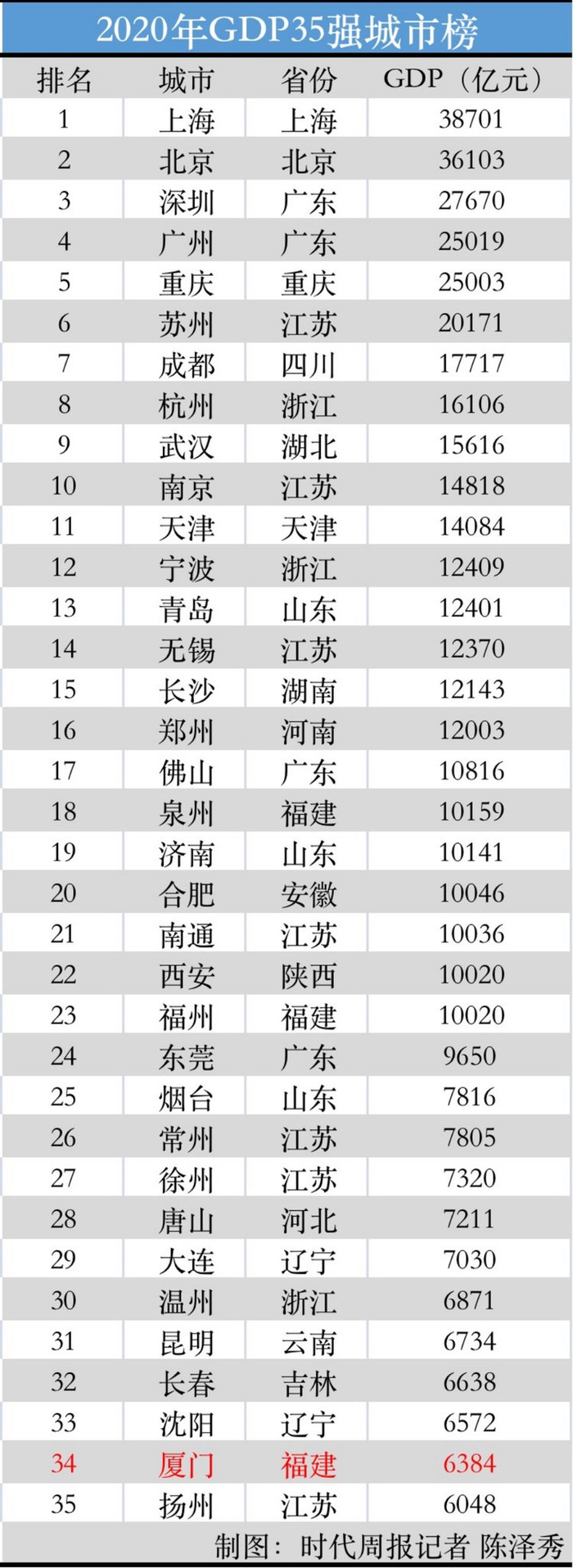 需要指出的是,与国内其他城市相比,厦门经济体量比较小。2020年厦门GDP为6384.02亿元,在全国各大城市中排在第34位,烟台、常州、徐州、唐山等一大批城市均在厦门之前。在福建省内,厦门也长期位居泉州、福州之后,仅位列第三位。