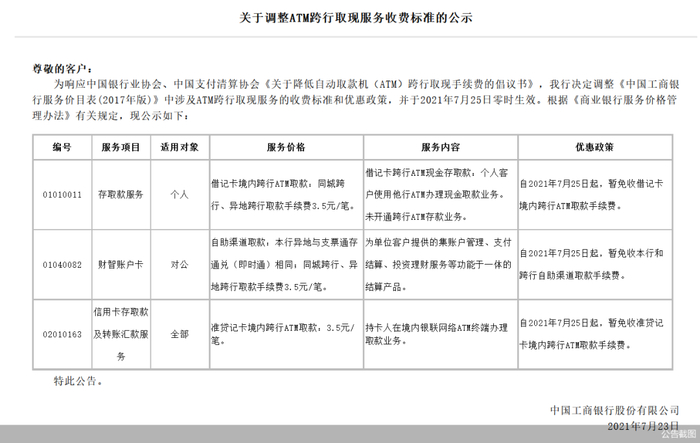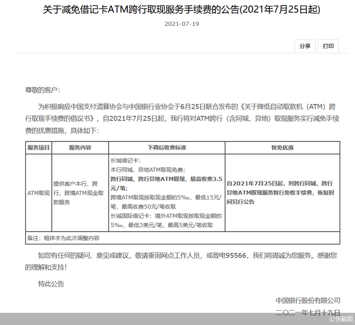 7月19日,中国银行发布减免ATM跨行取现手续费公告,该行表示,于7月25日对长城借记卡取现手续费进行调整,跨行同城、跨行异地ATM取现最高收费3.5元/笔,并暂行免收上述手续费,恢复时间另行公告。
