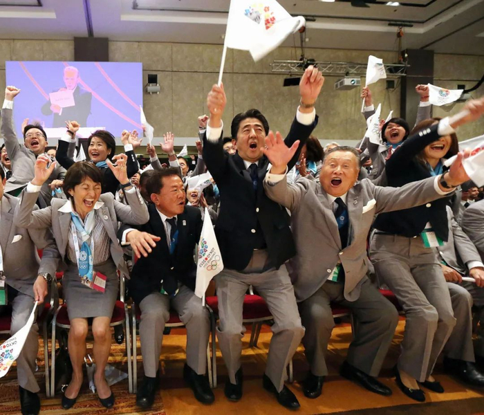 东京被选为2020年夏季奥运会主办城市后,日本前首相安倍晋三(中) 图片来源:视觉中国